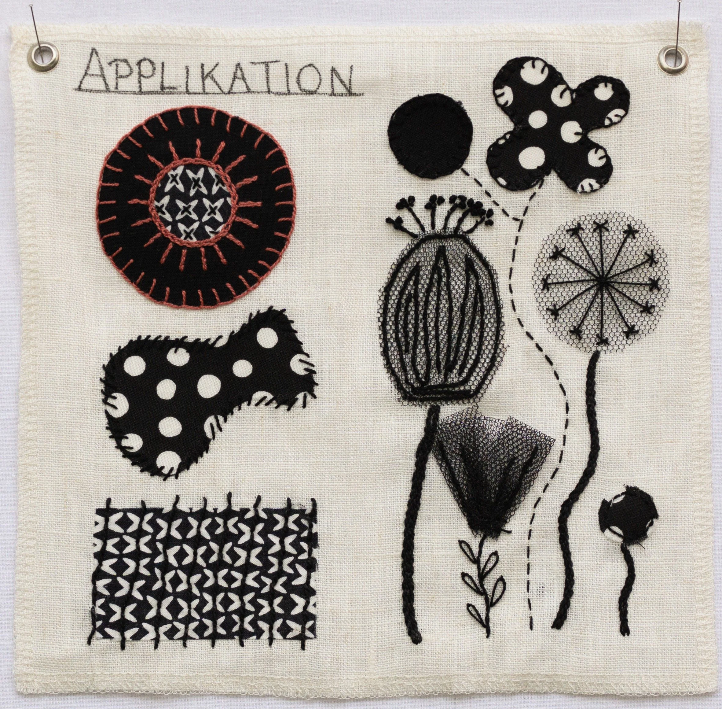 Applikation - Applikation skapar du genom att sy på ett tyg på ett annat. Du kan egentligen använda vilket typ av tyg som helst. Transaparenta tyger som t.ex tyll eller organsa kan bli dekorativt. Du kan också brodera på själva applikationen, här finns inga gränser till kreativitet. Langettstygn är ett bra stygn att använda när du skall sy fast din applikation. Vliesofix är bra att använda när du skall applicera tyget på bottentyget. Det håller applikationen på plats medan du arbetar.